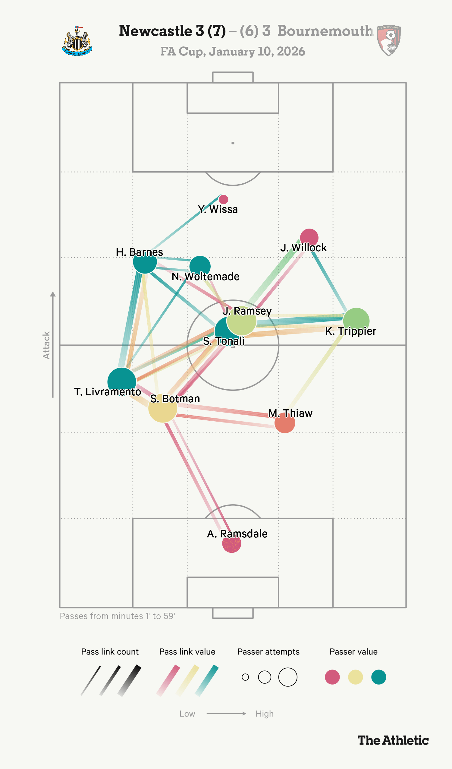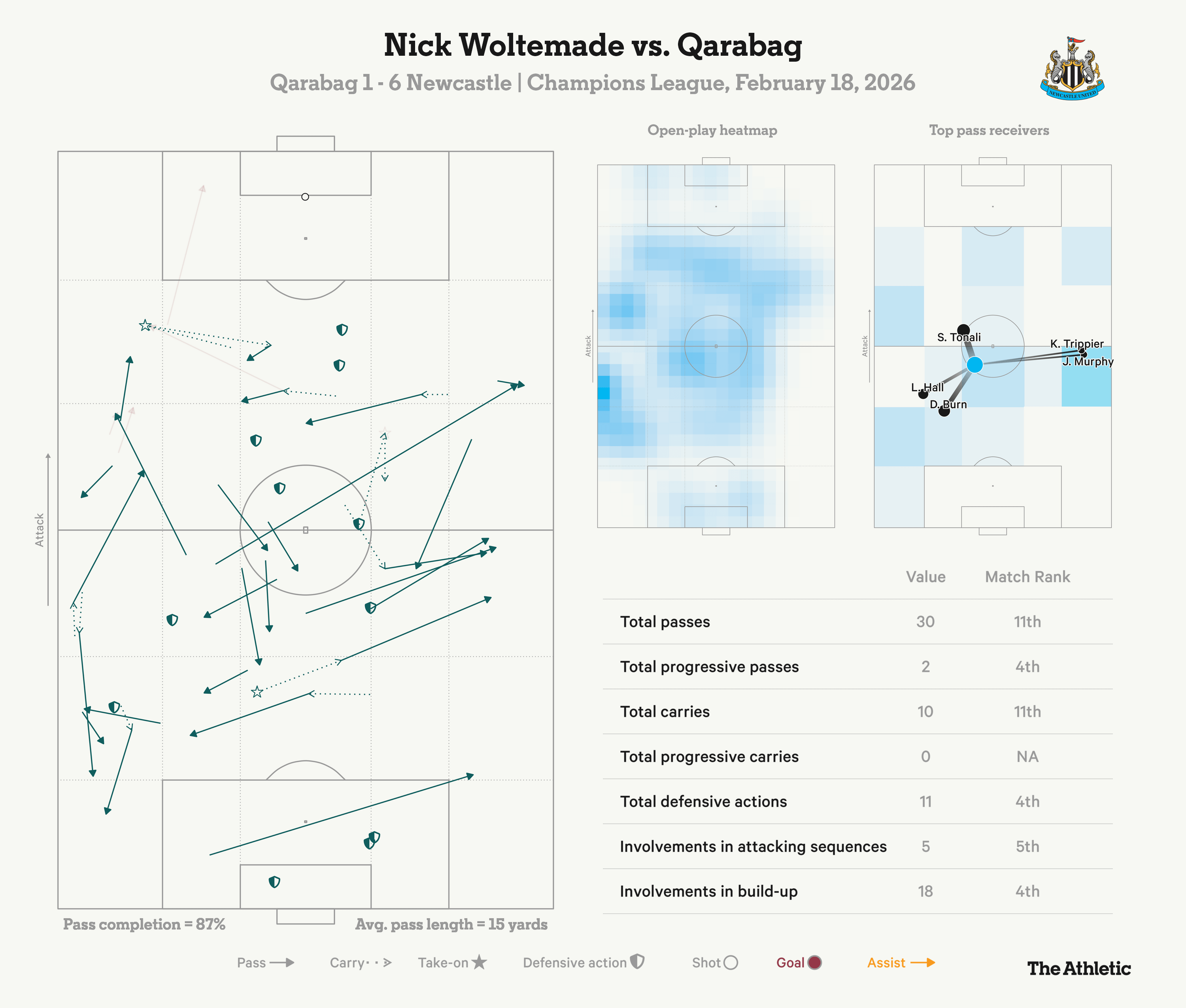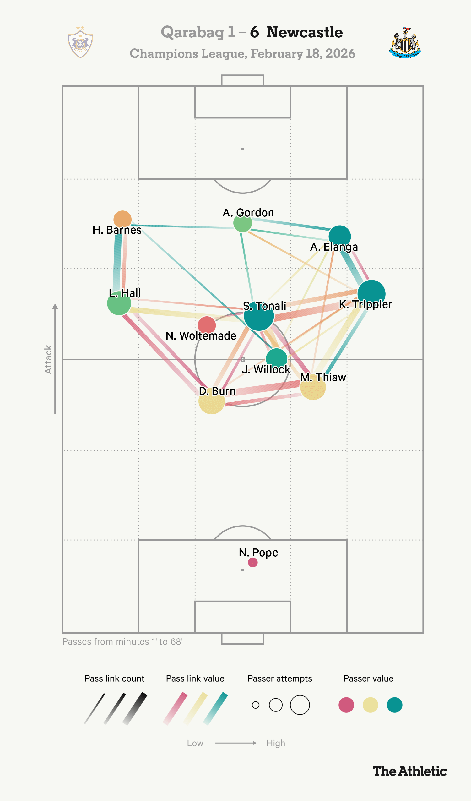 뉴캐슬 데뷔 후 첫 여섯 번의 유효 슈팅을 모두 골로 연결했지만, 스트라이커로서의 낮은 관여도와 박스 안 침투 부족은 그가 계속 최전방을 책임지기에는 지속 가능하지 않다는 신호였습니다. 골이 멈추자, 이 시스템에서 그가 스트라이커로 적합한지에 대한 의문이 커졌습니다.