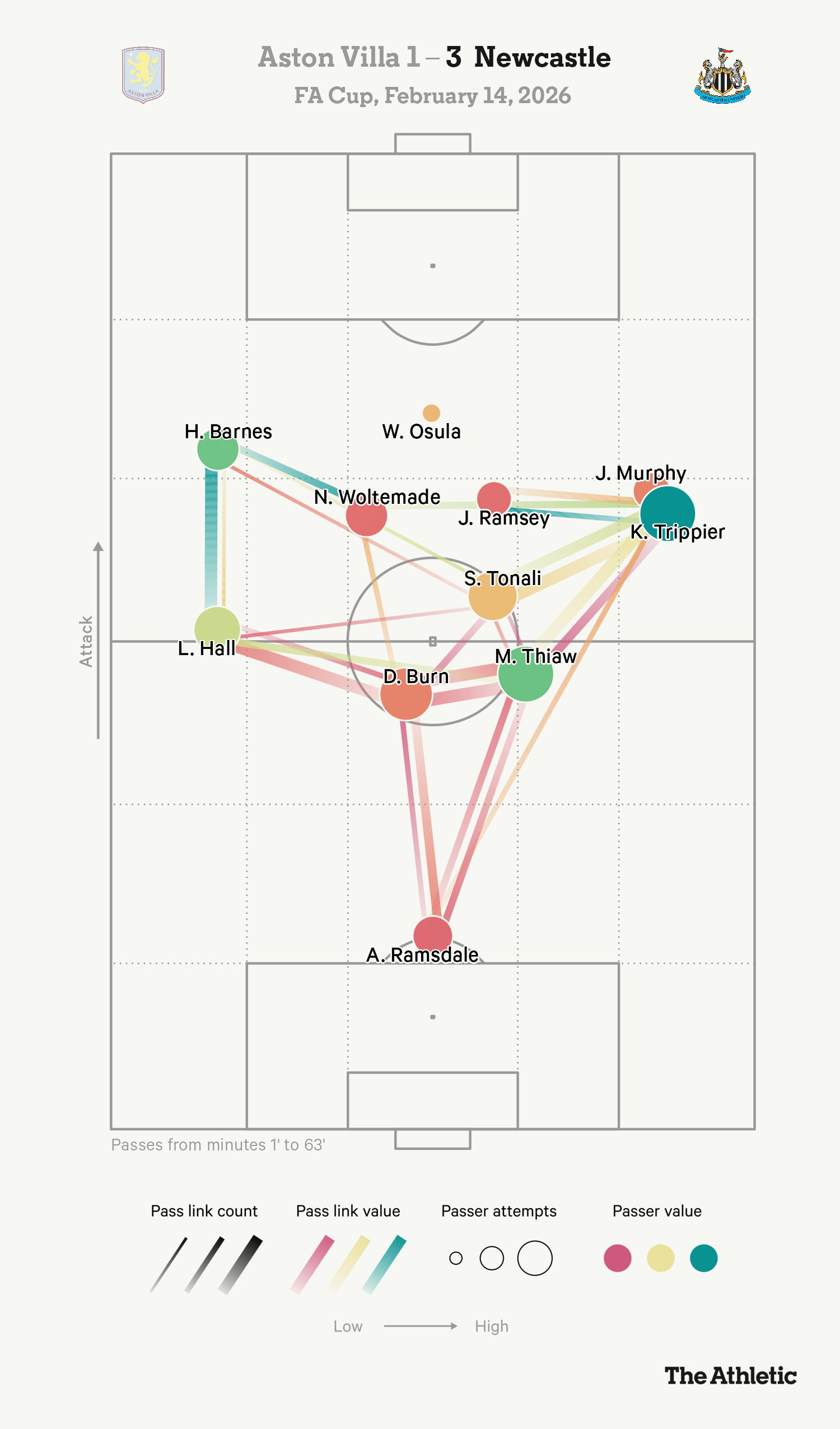 빌라전에서 뉴캐슬의 4-3-3은 종종 4-1-4-1처럼 보였습니다. 산드로 토날리가 더 깊이 머물고, 볼테마데와 제이콥 램지가 중원에서 전진했습니다.