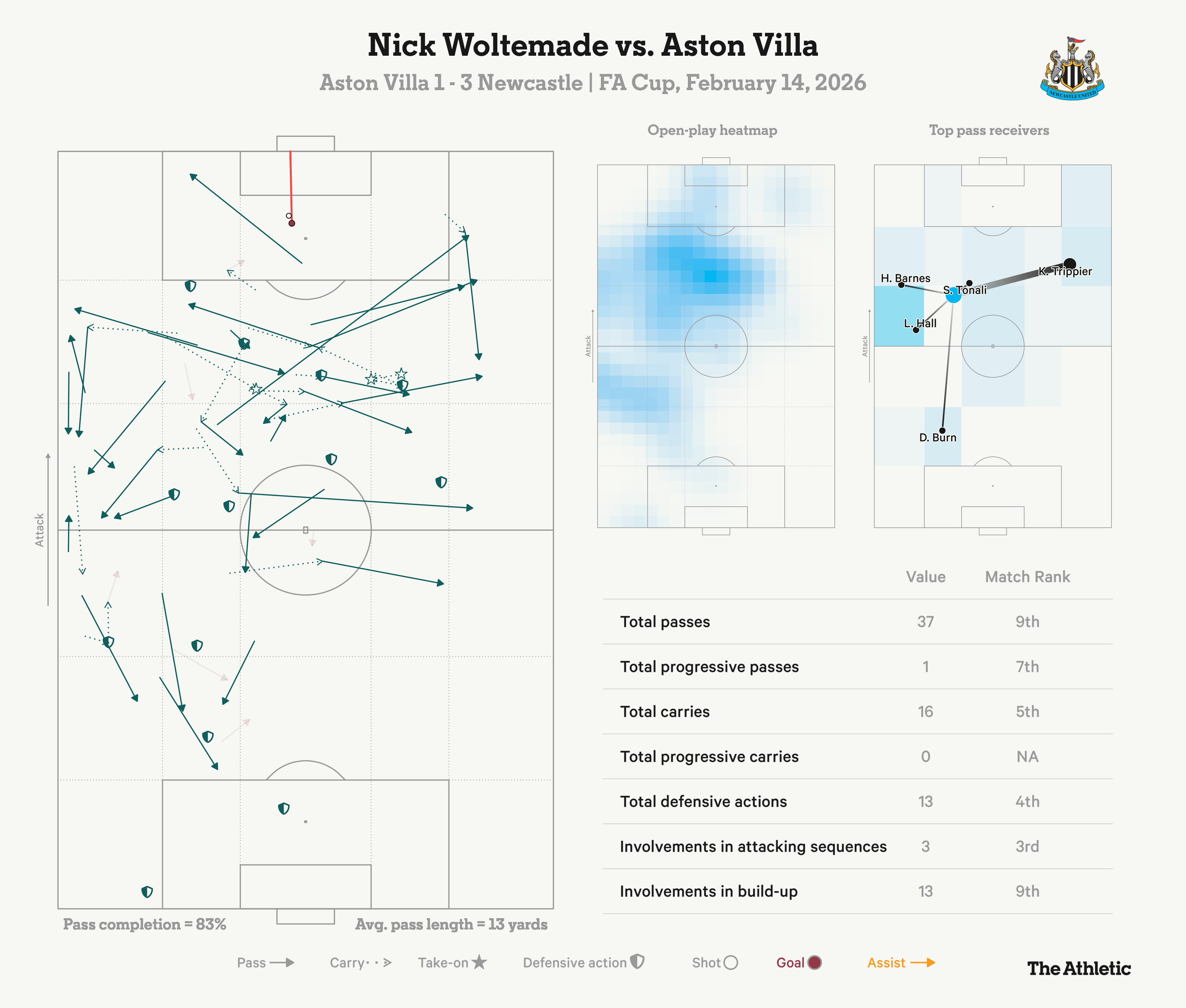 빌라전에서 볼테마데의 관여는 하프라인과 페널티 박스 사이에서 집중됐습니다. 그는 14경기 무득점 행진을 끊는 골을 기록했고, 공격 시퀀스 세 차례에 관여했으며, 13번의 수비 기여를 기록했습니다. 하우는 이것이 스트라이커로 뛸 때와 가장 큰 차이라고 평가했습니다.
